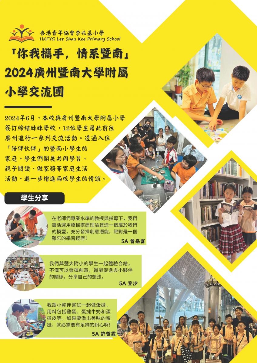 2024年6月,本校與廣州暨南大學附屬小學簽訂締結姊妹學校,12位學生藉此前往廣州進行一系列交流活動。透過入住「陪伴伙伴」的暨南小學生的家庭,學生們開展共同學習、親子閱讀、做家務等家庭生活活動,進一步增進兩校學生的情誼。