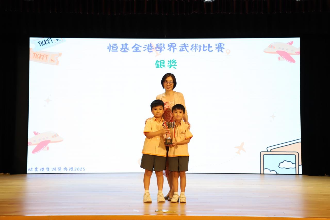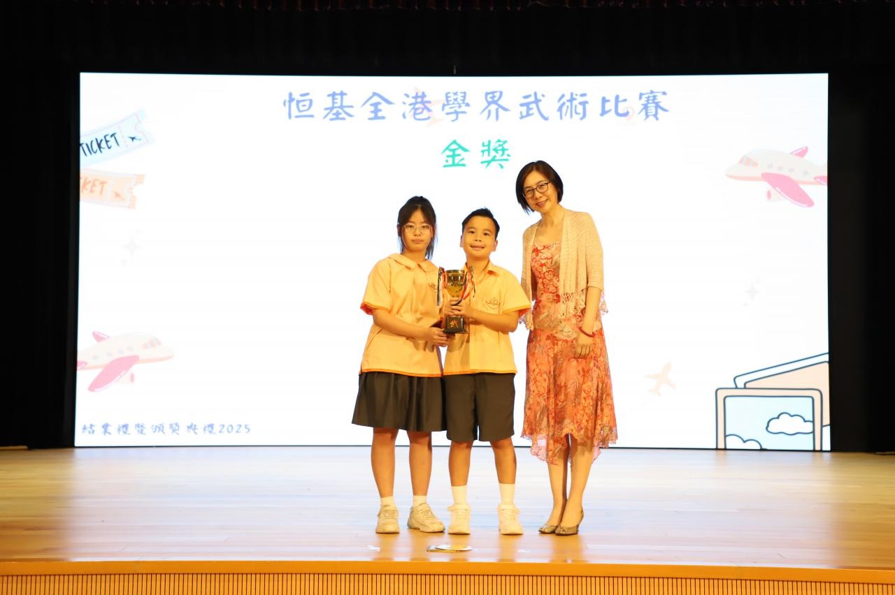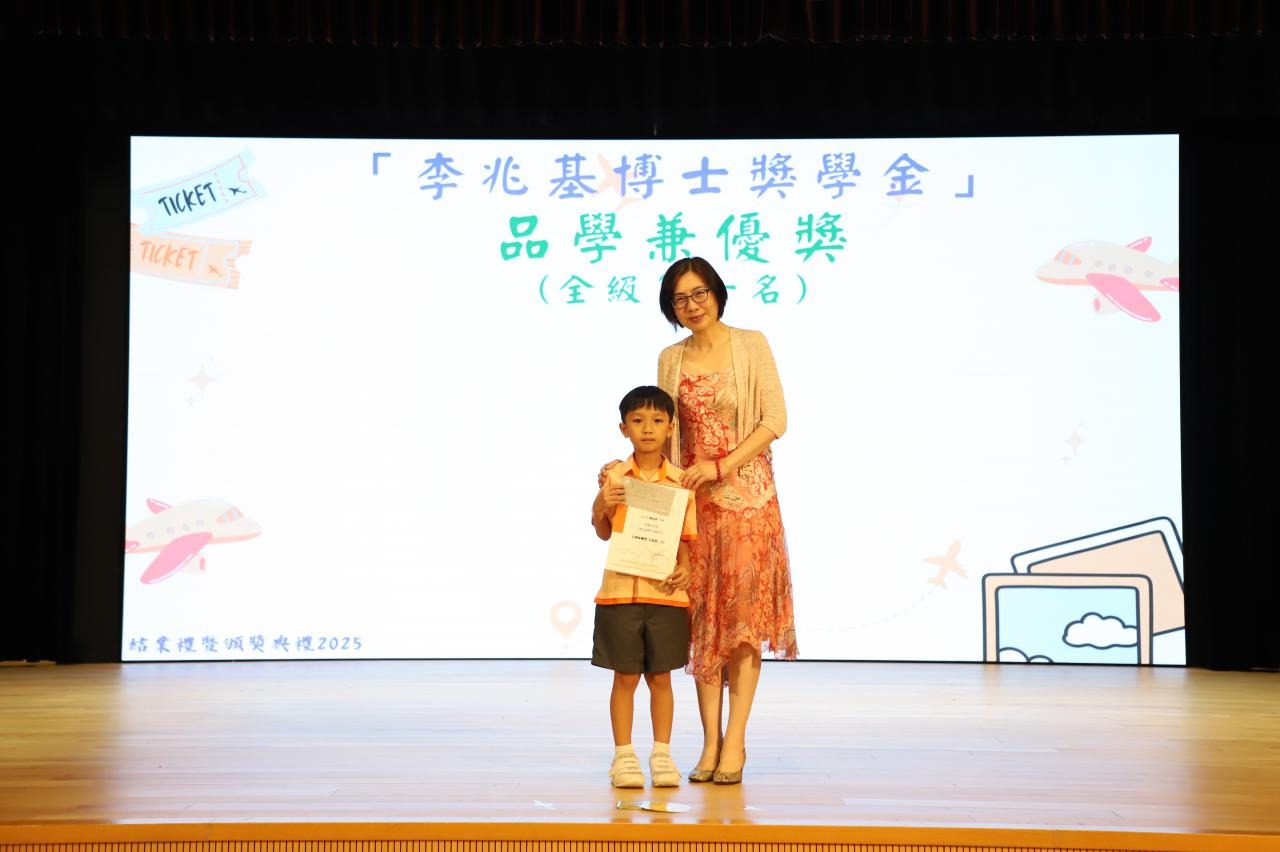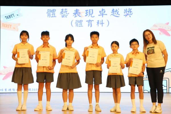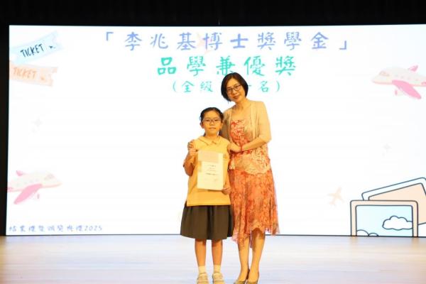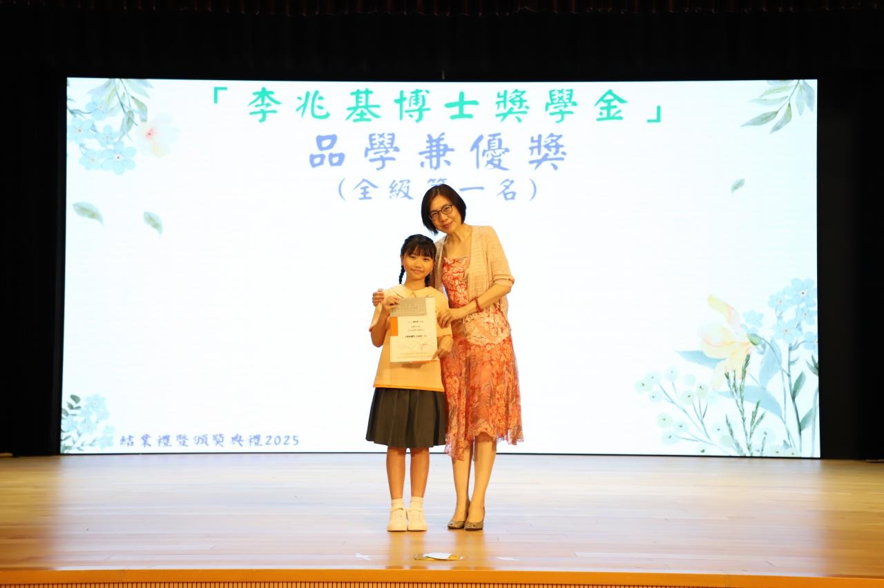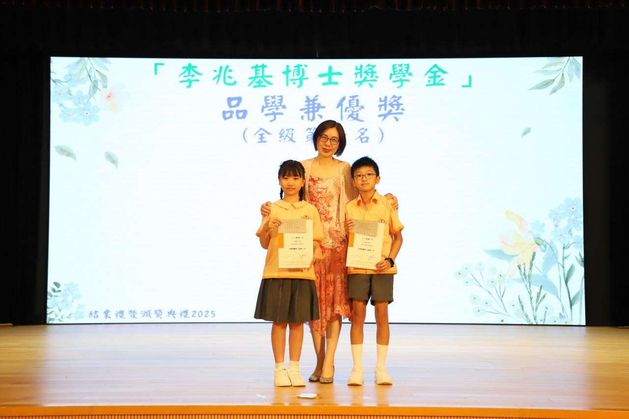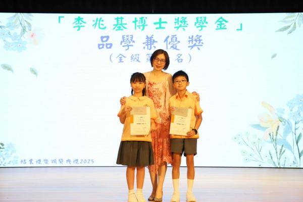 典禮的第二個環節是頒獎禮。本校有幸得到「李兆基博士基金」的鼎力贊助,設立了「李兆基博士獎學金」,該獎學金將持續十年,旨在表彰在學業、體藝、品德等多方面表現卓越的學生,鼓勵他們不斷追求卓越,並為學業與人生注入新的動力。本學年,學生在學業上取得了豐碩的成果,同時積極參與了多項活動,包括海外交流、全港性的比賽、區際競賽,以及學術與運動類的各項比賽,充分展現了全面發展的風采。在禮堂內,共頒發了70餘項獎項,獎盃與獎狀不僅是對學生努力的肯定,更是他們成長的見證。