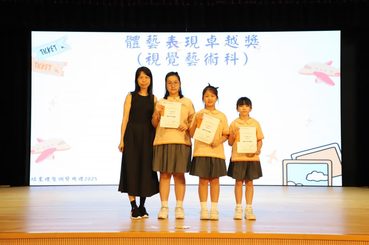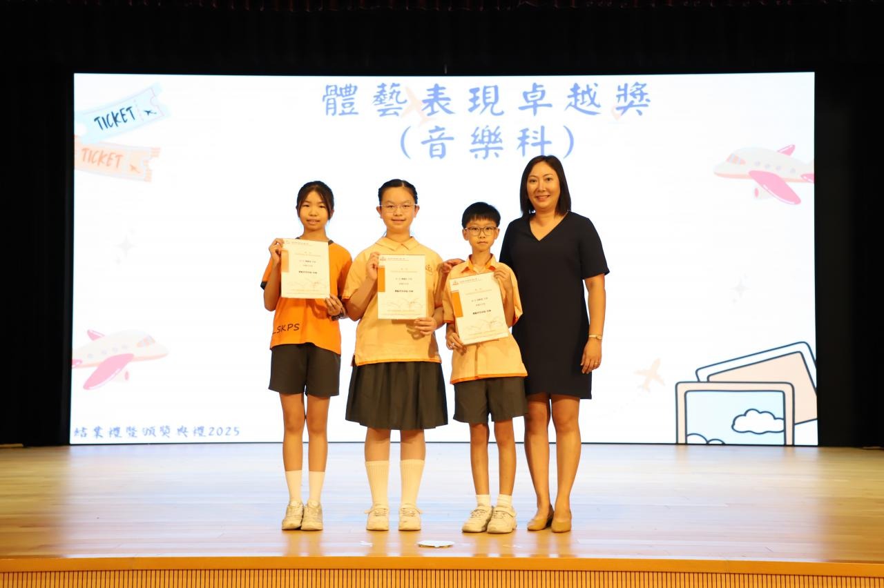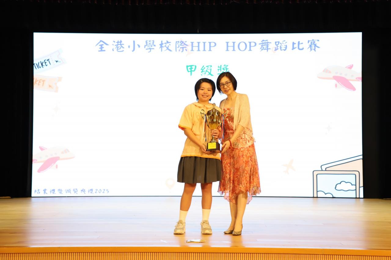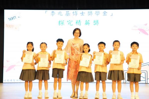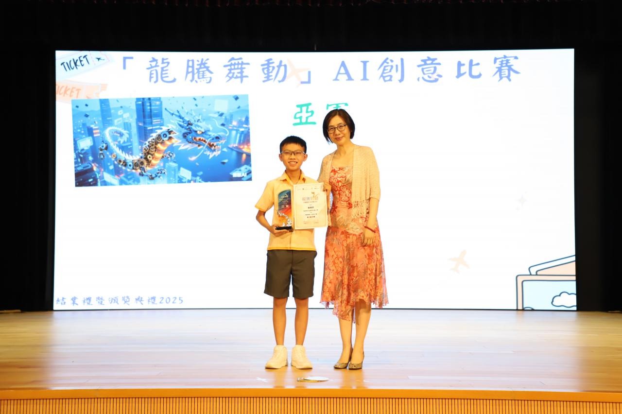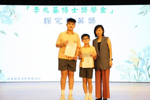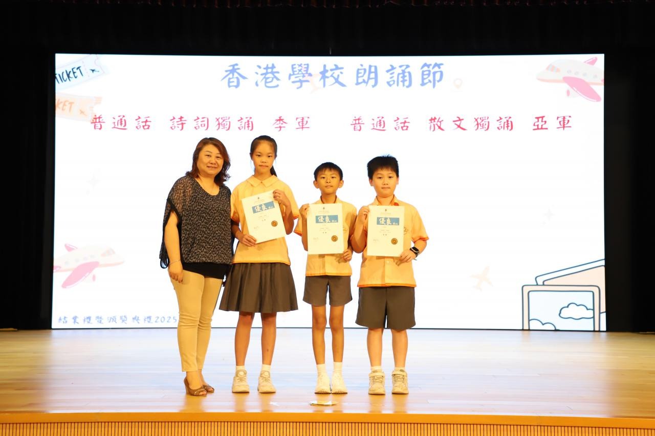 典禮的第二個環節是頒獎禮。本校有幸得到「李兆基博士基金」的鼎力贊助,設立了「李兆基博士獎學金」,該獎學金將持續十年,旨在表彰在學業、體藝、品德等多方面表現卓越的學生,鼓勵他們不斷追求卓越,並為學業與人生注入新的動力。本學年,學生在學業上取得了豐碩的成果,同時積極參與了多項活動,包括海外交流、全港性的比賽、區際競賽,以及學術與運動類的各項比賽,充分展現了全面發展的風采。在禮堂內,共頒發了70餘項獎項,獎盃與獎狀不僅是對學生努力的肯定,更是他們成長的見證。