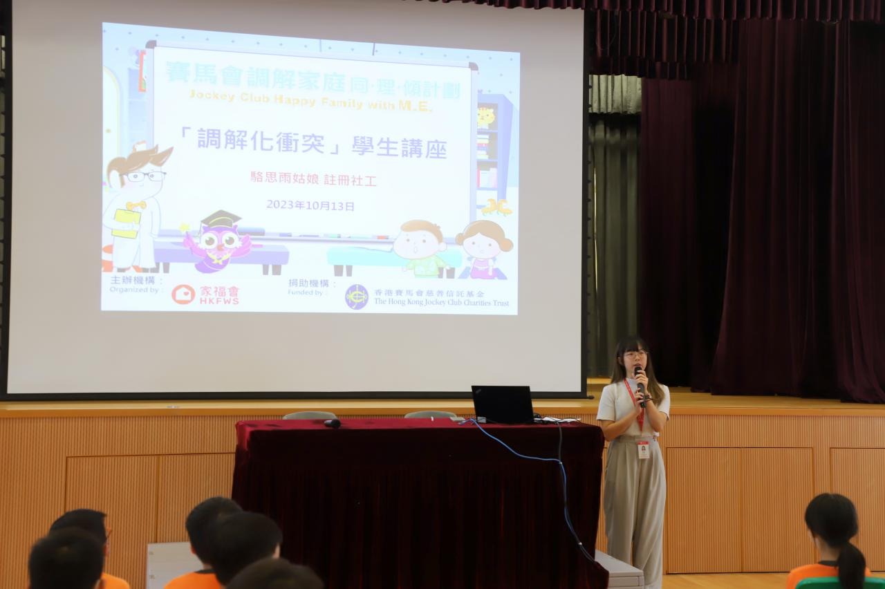 2023-10-13 在日常生活中與別人相處時,或許會因為彼此的不了解或想法不同而產生衝突。在發生衝突時,怎樣處理才會相對有效呢?本學年參加「賽馬會調解家庭同 • 理 • 傾計劃」,並邀請了家福會的社工駱姑娘到校向四至六年級講解如何認識自己的情緒及化解衝突小貼士。在講座期間,駱姑娘提供了不同的情境題,同學們都紛紛代入情景,出謀獻策,提供化解衝突的辦法呢! 學校活動