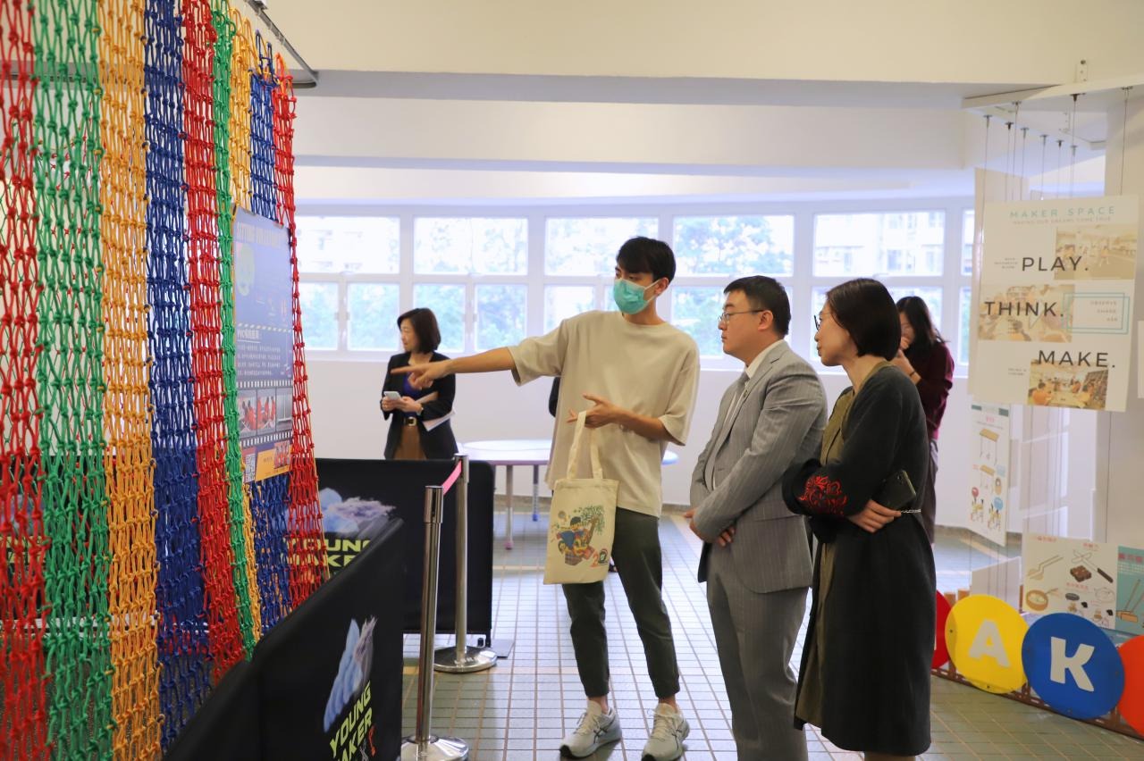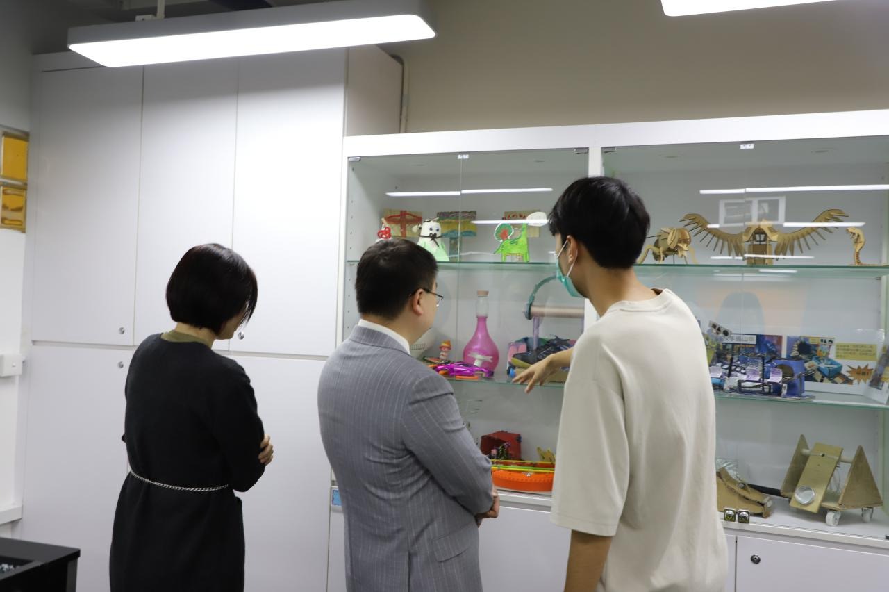 深入交流結束後,蔡教授參觀我們的創客專區,蔡教授盛讚我校給學生們創造的STEM設備和課程。我們給蔡教授贈送了用我校雷射切割機製作的實用禮品,為這次遊覽畫上了完美的句號。臨走前,蔡教授還帶走了我們專才「旭報」同學設計的「旭報」報紙,他笑道:「這次的行程真的是滿載而歸呀!」