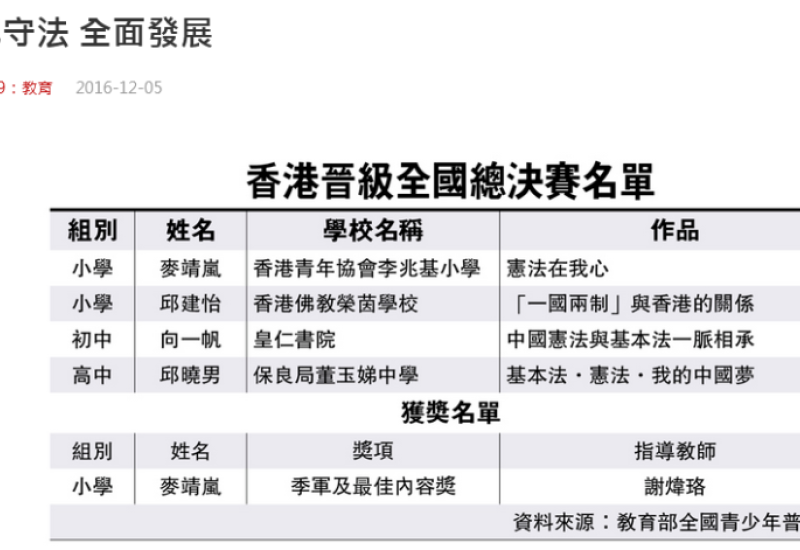點新聞: 香港學生《憲法在我心》作品獲小學組全國第三名