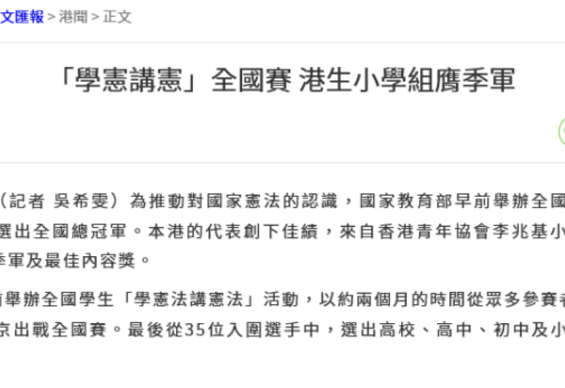 文匯報:「學憲講憲」全國賽 港生小學組膺季軍
