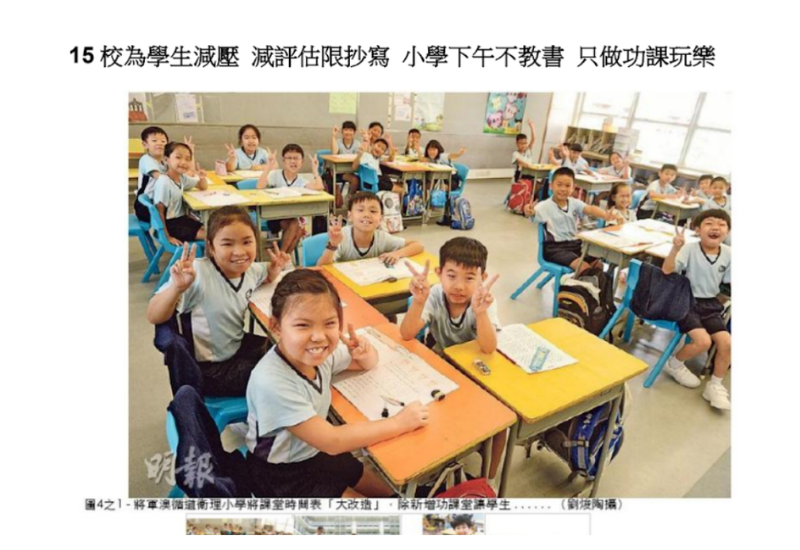 明報: 15校為學生減壓 減評估限抄寫 小學下午不教書 只做功課玩樂