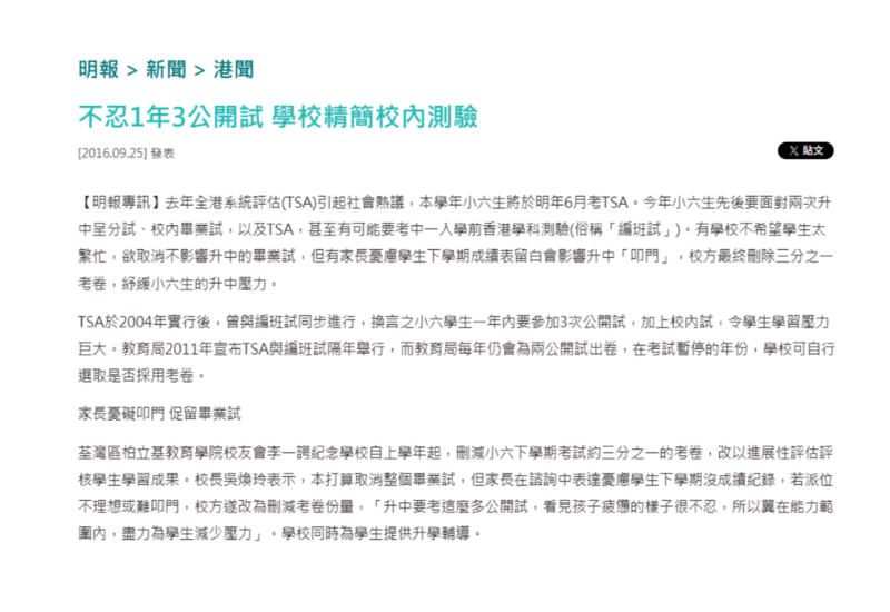 明報: 不忍1年3公開試 學校精簡校內測驗
