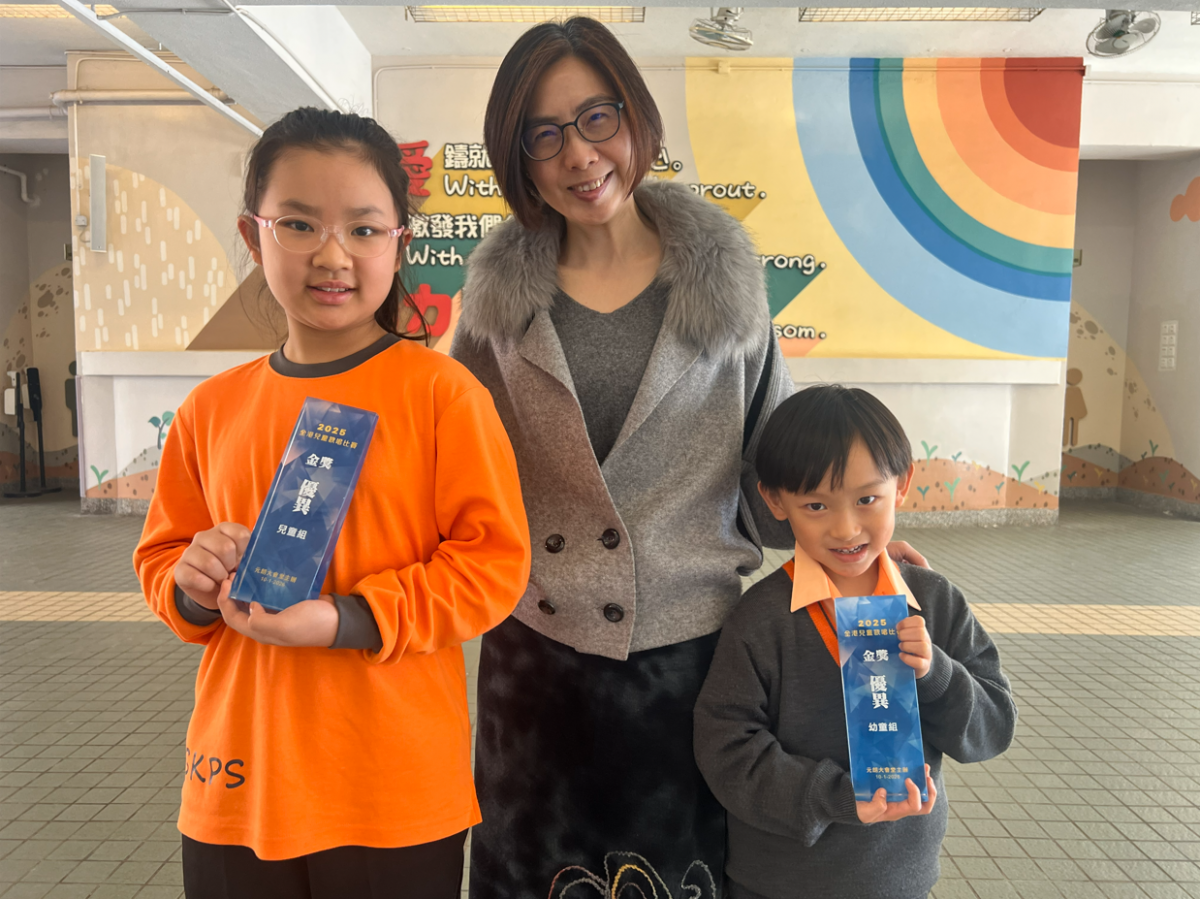 1A鄒承羲及4C楊曉瑜在1月10日《全港兒童歌唱比賽2025》決賽中分別獲得幼童組及兒童組金獎(優異)。