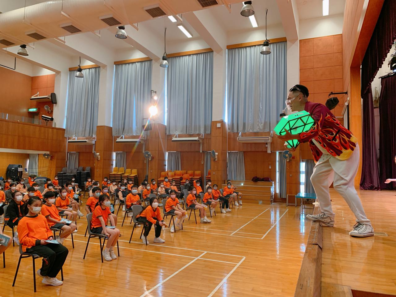 今天,小四同學在生活成長課到禮堂觀賞一套名為《勇破大麻城》的互動教育劇場。演員們以生動有趣的方式,告訴同學毒品的禍害,而每一位同學亦獲得一本「禁毒護照」。在表演其間,演員會向台下的學生詢問一些問題,同學需要在護照中找出答案,而答案亦會影響演員們其後的演出。同學們十分喜歡這種模式,踴躍參與呢!
