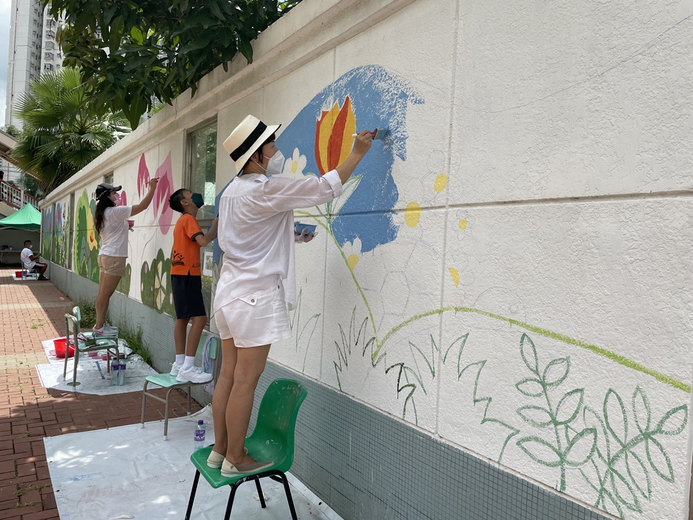 本校一向重視學生的藝術教育,給予學生在藝術層面上作多方面體驗及發展的機會,校園壁畫創作是其中一項藝術活動。機緣巧合下,我們邀請了6B張津銘媽媽以「幸福森林」為題設計外牆壁畫。與此同時,本校成功參加了賽馬會油牆作樂校園藝術計劃,並邀請了藝術家Mick Chan於8月24日至26日到校,帶領本校家長及學生在校園外牆進行壁畫創作,讓他們可以學習繪畫壁畫的技巧及培養欣賞不同藝術作品的態度。天氣雖然非常炎熱,但無阻大家的熱情創作,感謝他們那充滿藝術熱情的畫筆,把校園外牆粉飾得色彩繽紛,讓我們如置身於綠悠悠的大自然中,歡迎大家前來觀看。