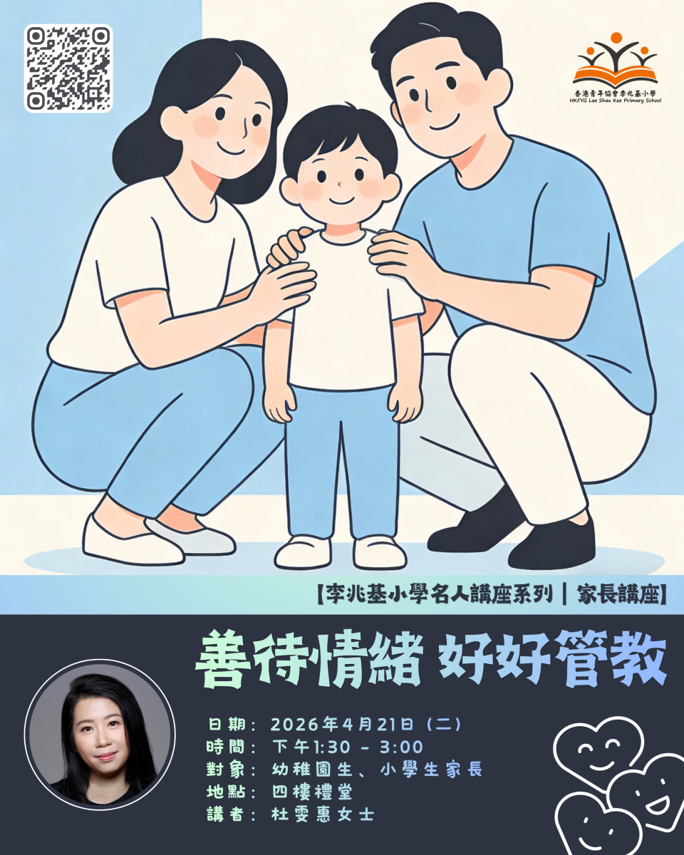 本校即將舉辦的名人講座系列之「善待情緒 好好管教」家長講座。幼稚園高班孩子正面臨升小過渡,情緒波動與行為挑戰往往倍增;家長在陪伴成長的同時,亦難免感到壓力。是次講座內容能讓家長學習如何先安頓自己的情緒,再有效引導孩子,將管教難題化為親子成長的契機。